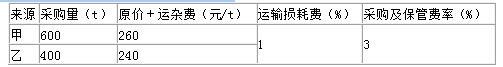从甲、乙两地采购某工程材料,采购量及有关费用如下表所示。该工程材料的材料单价为()元/t。