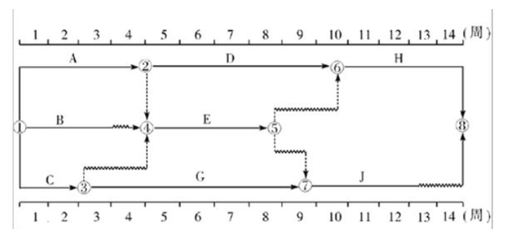 某工程双代号时标网络计划如下图所示(单位:周),其中工作B的总时差和自由时差()