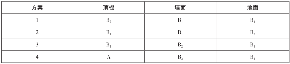 某多层办公建筑,设有自然排烟系统,未设置集中空气调节系统和自动喷水灭火系统,该办公建筑内建筑面积为200m2的房间有4种装修方案,各部位装修材料的燃烧性能等级见下表,其中正确的方案是( )。