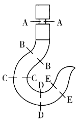 起重机械吊钩的断裂可能导致重大的设备及人身伤害事故。吊钩受力比较复杂,磨损比较大。吊钩检验中,必须了解吊钩的危险断面所在位置。右图中,吊钩的危险断面位置包括( )。