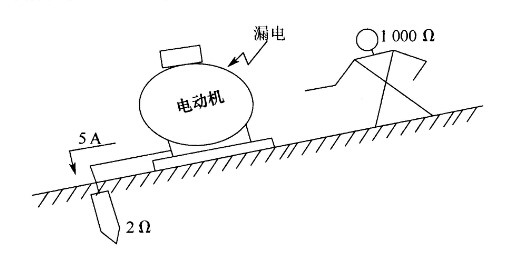 对于工频电流,人的感知电流约为0.5~1mA、摆脱电流约为5~10mA,室颤电流约为50mA。某事故现场如下图所示,电动机接地装置的接地电阻为2Ω;该电动机漏电,流过其接地装置电流为5A;地面十分潮湿。如果电阻1000Ω的人站在地面接触该电动机,可能发生最严重的情况是( )。