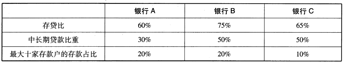假设其他条件完全相同,则流动性风险管理压力最大的银行是( )。
