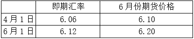 4月1日,国内某公司有20万美元的应付账款,到期日为6月1日。为规避汇率波动风险,该公司于当天买入两手6月份到期的美元兑人民币期货合约。至6月1日,该公司在即期外汇市场买入美元用于支付账款,同时将6月份期货合约对冲平仓。4月1日和6月1日相关市场汇率如下表所示。