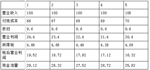 甲方案:需要投资50万元,预计使用寿命为5年,折旧采用直线法,预计净残值为2万元。当年投资当年完工并投入运营。投入运营时需要垫支营运资金20万元,投入运营后预计年营业收入100万元,第1年付现成本66万元,以后在此基础上每年增加维修费1万元。