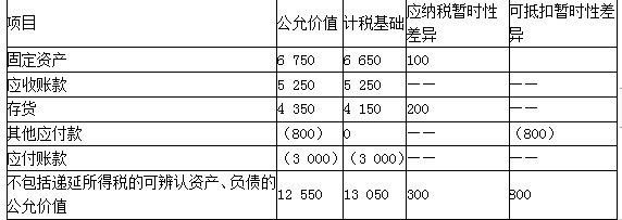甲企业以增发市场价值为12650万元的自身普通股为对价购入乙企业100%的净资产,对乙企业进行吸收合并,合并前甲企业与乙企业不存在任何关联方关系。假定该项合并符合税法规定的免税合并条件,交易各方选择进行免税处理,购买日乙企业各项可辨认资产、负债的公允价值及其计税基础如下表所示(单位:万元)。乙企业适用的所得税税率为25%,预期在未来期间不会发生变化。
