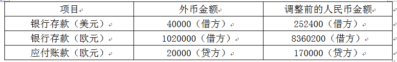 (1)① 借:原材料 1870000(200000×8.5+170000) 应交税费——应交增值税(进项税额) 243100 贷:应付账款——乙公司(欧元) 1700000(200000×8.5) 银行存款——××银行(人民币)413100(170000+243100) ② 借:应收账款——丙公司(美元) 253600(40000×6.34) 贷:主营业务收入 253600 ③ 借:银行存款——××银行(欧元) 1652000(200000×8.26) 财务费用——汇兑差额 8000 贷:银行存款——××银行(人民币)1660000(200000×8.3) ④ 借:银行存款——××银行(欧元)8240000(1000000×8.24) 贷:实收资本 8000000 资本公积——资本溢价 240000 ⑤ 借:应付账款——乙公司(欧元) 1530000(180000×8.5) 财务费用——汇兑差额 1800 贷:银行存款——××银行(欧元) 1531800(180000×8.51) ⑥ 借:银行存款——××银行(美元) 252400(40000×6.31) 财务费用——汇兑差额 1200 贷:应收账款——丙公司(美元) 253600(40000×6.34) (2)期末计算汇兑差额 期末银行存款美元账户汇兑差额=40000×6.3-252400=-400(元人民币)(汇兑损失) 期末银行存款欧元账户汇兑差额=1020000×8.16-8360200=-37000(元人民币)(汇兑损失) 期末应付账款账户汇兑差额=20000×8.16-170000=-6800(元人民币)(汇兑收益) 借:应付账款——乙公司(欧元) 6800 财务费用 30600 贷:银行存款——××银行(美元) 400 ——××银行(欧元) 37000