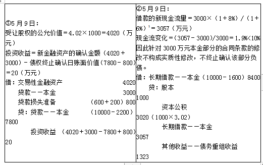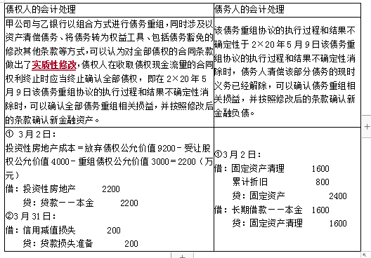 2×16年1月1日,甲公司取得乙银行贷款10000万元,约定贷款期限为4年(即2×19年12月31日到期),年利率6%,按年付息,甲公司已按时支付所有利息。2×19年12月31日,甲公司出现严重资金周转问題,多项债务违约,信用风险增加,无法偿还贷款本金。 (1)2×20年1月10日,乙银行同意与甲公司就该项贷款重新达成协议,新协议约定: ①甲公司将一项作为固定资产核算的房产转让给乙银行,用于抵偿债务本金2000万元,该房产账面原值2400万元,累计折旧800万元,未计提减值准备;合同生效日 ②甲公司向乙银行增发股票1000万股,面值1元/股,占甲公司股份总额的1%,用于抵偿债务本金4000万元,甲公司股票于2×20年1月10日的收盘价为4元/股; ③在甲公司履行上述偿债义务后,乙银行免除甲公司1000万元债务本金,并将尚未偿还的债务本金3000万元展期至2×20年12月31日,年利率8%;如果甲公司未能履行①②所述偿债义务,乙银行有权终止债务重组协议,尚未履行的债权调整承诺随之失效。 (2)乙银行该贷款于2×20年1月10日的公允价值为9200万元,予以展期的贷款的公允价值为3000万元。乙银行以摊余成本计量该贷款,已计提货款损失准备600万元。甲公司以摊余成本计量该贷款,裁至2×20年1月10日,该贷款的账面价值为10000万元。不考虑相关税费。 (3)2×20年3月2日,双方办理完成房产转让手续,乙银行将该房产作为投资性房地产核算。 (4)2×20年3月31日,乙银行为该笔贷款补提了200万元的损失准备。 (5)2×20年5月9日,双方办理完成股权转让手续,乙银行将该股权投资分类为以公允价值计量且其变动计入当期损益的金融资产,甲公司股票当日收盘价为4.02元/股。 要求:分别编制债权人(乙银行)和债务人(甲公司)的会计分录。