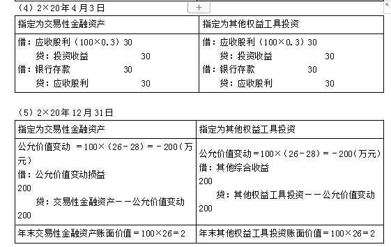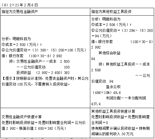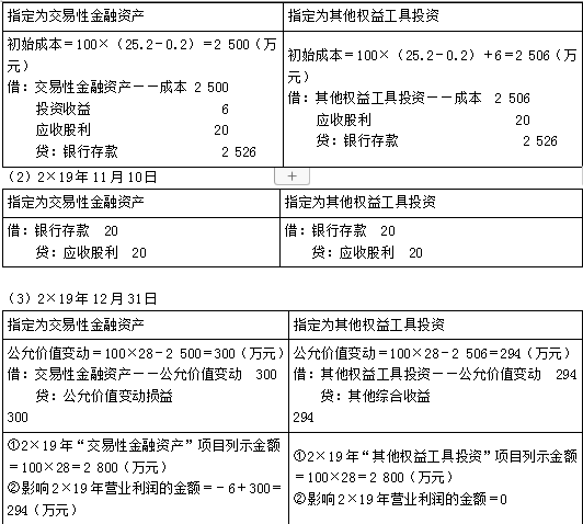 A公司按照净利润的10%计提盈余公积金,有关股票投资业务如下。 (1)2×19年11月6日,A公司购买B公司发行的股票100万股,成交价为每股25.2元,其中包含已宣告但尚未发放的现金股利每股0.2元,另付交易费用6万元,占B公司表决权资本的1%。 (2)2×19年11月10日,收到上述现金股利; (3)2×19年12月31日,该股票每股市价为28元; (4)2×20年4月3日,B公司宣告发放现金股利每股0.3元,4月30日,A公司收到现金股利。 (5)2×20年12月31日,该股票每股市价为26元,假定判断为暂时性下跌。 (6)2×21年2月6日,A公司出售B公司全部股票,出售价格为每股30元,另支付交易费用8万元。 A公司将该股票分类为两种假定情况: (1)将其指定为以公允价值计量且其变动计入当前损益的金融资产; (2)将其指定为以公允价值计量且其变动计入其他综合收益的非交易性权益工具投资。 要求:根据以上资料分别两种情况,编制交易性金融资产和其他权益工具投资的相关会计分录。【此处仅用于对比相关处理】