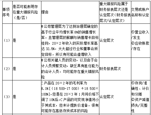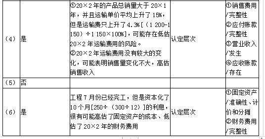 针对资料一(1)至(6)项,结合资料二,假定不考虑其他条件,请逐项指出资料一所列事项是否可能表明存在重大错报风险。如果认为存在,请简要说明理由,并分别说明该风险是属于财务报表层次还是认定层次。如果认为属于认定层次,请指出相关事项与何种交易或账户的何种认定相关。请将答案直接填入相应表格内。