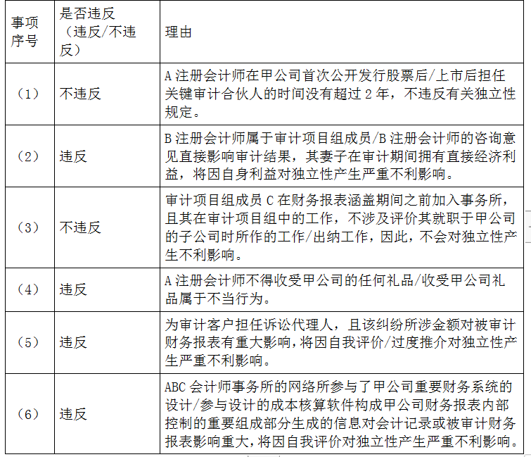 ABC会计师事务所委派A注册会计师担任上市公司甲公司2015年度财务报表审计项目合伙人,ABC会计师事务所和XYZ公司处于同一网络,审计项目组在审计中遇到下列事项: (1)甲公司于2014年8月首次公开发行股票并上市,A注册会计师自2010年度起担任甲公司财务报表审计项目合伙人。 (2)2015年10月,审计项目组就某重大会计问题咨询了事务所技术部的B注册会计师,B注册会计师的妻子于2015年6月购买了甲公司的股票,于2015年12月卖出。 (3)审计项目组成员C曾任甲公司重要子公司的出纳,2014年10月加入ABC会计师事务所,2015年9月加入甲公司审计项目组参与审计固定资产项目。 (4)A注册会计师受邀参加了甲公司年度股东大会,全体参与人员均获得甲公司生产的移动硬盘作为礼品。 (5)甲公司聘请XYZ公司担任某合同纠纷的诉讼代理人,诉讼结果将对甲公司财务报表产生重大影响。 (6)甲公司购买的成本核算软件由XYZ公司和一家软件公司共同开发和推广,该软件公司不是ABC会计师事务所的审计客户或其关联实体。 (1)要求: 针对上述第(1)至(6)项,逐项指出是否存在违反中国注册会计师职业道德守则有关独立性规定的情况,并简要说明理由。将答案直接填入答题区相应的表格内。
