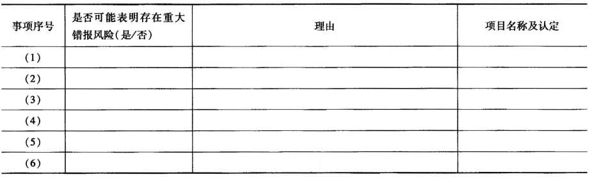 针对资料一(1)至(6)项,结合资料二,假定不考虑其他条件,逐项指出资料一所列事项是否可能表明存在重大错报风险。如果认为存在重大错报风险,简要说明理由,并说明该风险主要与哪些项目(仅限于营业收入、营业成本、销售费用、应收账款、坏账准备、存货和其他应付款)的哪些认定相关。将答案直接填入相应表格内。