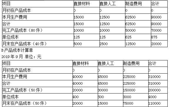甲公司是一家制造业企业,生产A、B两种产品。生产车间有两台设备,其中,一台属于高端智能制造设备,另一台属于手工加工设备。A、B产品均需先后经过智能制造和手工加工两道作业工序方可完成。A产品主要由智能制造设备完成,B产品主要由手工加工设备完成。直接材料均在开工时一次性投入。公司现采用传统成本计算法计算成本,直接材料、直接人工直接计入产品成本,制造费用先按车间归集,再按直接人工工资比例分配进入产品成本。2019年9月生产成本相关资料如下: