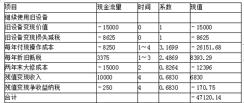 由于继续使用旧设备的现金流出总现值(47120.14)低于购置新设备的现金流出总现值(67828.65),所以应继续使用旧设备。