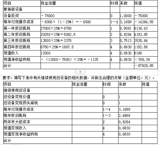备注:旧设备采用直线法计提折旧,每年折旧额为13500元;新设备采用年数总和法计提折旧,各年折旧额分别为:第一年27000元、第二年20250元,第三年13500元、第四年6750元。等风险投资的必要报酬率为10%。