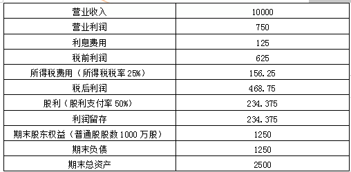 (1)2019年可持续增长率计算: 营业净利率=468.75/10000=4.69% 总资产周转率=营业收入/总资产=10000/2500=4(次) 权益乘数=总资产/股东权益=2500/1250=2 利润留存率=234.375/468.75=50% 可持续增长率=(营业净利率×总资产周转率×期末总资产权益乘数×利润留存率)/(1-营业净利率×总资产周转率×期末总资产权益乘数×利润留存率)=(4.69%×4×2×50%)/(1-4.69%×4×2×50%)=23.09% (2)①设营业净利率为x,则: 35%=(x×50%×2×4)/(1-x×50%×2×4) 求得:x=6.48%。 ②预计营业收入=10000×(1+35%)=13500(万元) 总资产=营业收入/总资产周转率=13500/4=3375(万元) 期末股东权益=总资产/权益乘数=3375/2=1687.5(万元) 期初股东权益=1250(万元) 本期利润留存=预计营业收入×营业净利率×利润留存率=13500×4.69%×50%=316.58(万元) 需要筹集外部权益资本=期末股东权益-期初股东权益-本期利润留存=1687.5-1250-316.58=120.92(万元)。