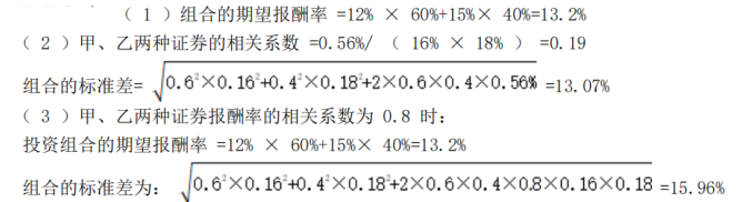 ( 4 )以上计算结果表明,证券报酬率相关系数的大小对投资组合的期望报酬率没有影响,但对投资组合的标准差有影响,在其他条件不变的前提下,相关系数越大,投资组合的标准差越大,组合的风险也越大。