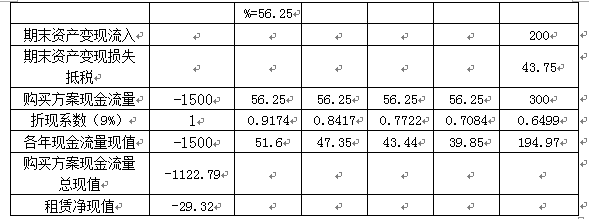 (3)项目的调整净现值=项目常规净现值+租赁净现值=-33.73-29.32=-63.05(万元),所以企业利用租赁扩充生产能力是不可行的。