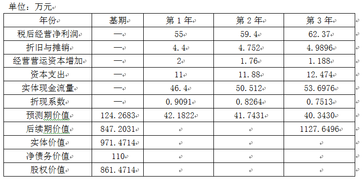 D公司目前经营营运资本为20万元,资本支出为10万元,税后经营净利润为50万元,当期折旧与摊销为4万元,净负债为110万元,预计未来3年为详细预测期,未来第1年销售增长率为10%,第2年销售增长率为8%,第3年销售增长率为5%,从第4年开始进入稳定增长阶段,实体现金流量增长率为5%。假设该公司税后经营净利润、经营营运资本、资本支出、折旧与摊销是和销售收入同比例变动。普通股当前每股市价5元,流通在外的普通股股数为100万股。企业当前的加权平均资本成本为10%,简化计算以当前净负债的账面价值作为净债务价值。
