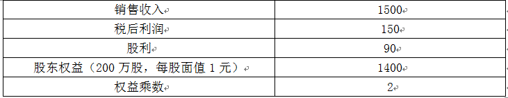 (1)2019年留存收益=150-90=60(万元) 2019年的可持续增长率=期初权益本期净利率×本期利润留存率=[150/(1400-60)]×60/150=4.48% (2)2019年的市盈率和市销率: 市盈率=15/(150/200)=20 市销率=15/(1500/200)=2 (3)若该公司处于稳定增长状态,其股利增长率等于可持续增长率,即4.48%。 目前的每股股利=90/200=0.45(元) 权益资本成本=0.45×(1+4.48%)/15+4.48%=7.61% (4)每股税后利润=150/200=0.75(元) 2019年每股净经营资产净投资=每股经营营运资本增加额+每股资本支出-每股折旧与摊销=0.2+0.6-0.4=0.4(元) 由权益乘数2,可知资产负债率为50%。 2019年每股股权现金流量=每股税后利润-(1-资产负债率)×每股净经营资产净投资=0.75-(1-50%)×0.4=0.55(元) 每股股权价值=下期股权现金流量/(股权资本成本-永续增长率)=0.55×(1+4.48%)/(7.61%-4.48%)=18.36(元) (5)用市盈率模型和市销率模型评估B公司的每股价值: ①市盈率模型 B公司的每股收益=500/500=1(元) B公司的每股股权价值=1×20=20(元) ②市销率模型 B公司的每股销售收入=3000/500=6(元) B公司的每股股权价值=6×2=12(元)。