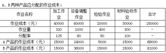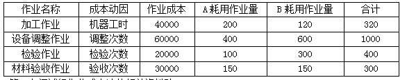 2019年8月第一车间A产品领用的直接材料成本为100000元,直接人工成本80000元;B产品领用的直接材料成本为80000元,直接人工成本80500元;两种产品一共耗用的制造费用为150000元,该企业试行作业成本法,将制造费用进行分配,公司管理会计师对第一车间按以下作业进行了划分。有关资料如下: