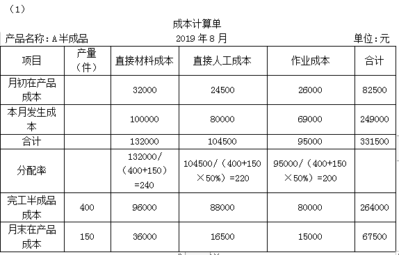 产品名称:A半成品 2019年8月 单位:元