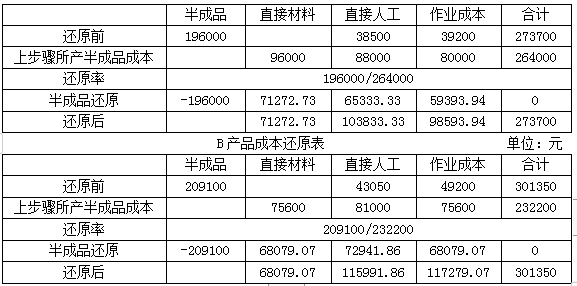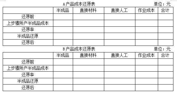 (3)对第二车间A产品和B产品的产成品成本分别进行成本还原,还原时按第一车间本月所产半成品成本项目的构成比例进行还原。