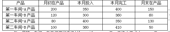 某企业大量生产A、B两种产品,生产分为两个步骤,分别由第一车间、第二车间进行。第一车间是机加工车间(包括加工作业、设备调整作业、检验作业、材料验收作业),第一车间为第二车间提供半成品,第二车间为组装车间(包括组装、检验、包装等)。该车间采用逐步综合结转分步法计算产品成本,采用约当产量法在产成品和月末在产品之间进行分配,各步骤在产品的完工程度为本步骤的50%,材料均在生产开始时一次投入,半成品在第二车间生产开始时一次投入,其他成本费用陆续发生。第一车间完工产品全部结转到第二车间,不设半成品库。