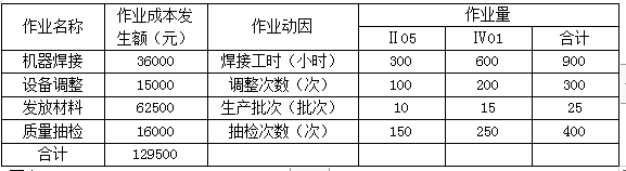 假设经作业分析,该厂根据各项作业的成本动因性质划分了机器焊接、设备调整、发放材料和质量抽检等四个作业,各作业动因及作业成本发生额等有关资料如下表: