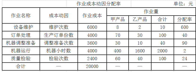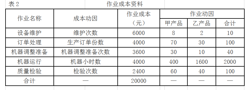 K企业每年制造费用总额为20000元,甲、乙两种产品复杂程度不一样,耗用的作业量也不一样。K企业与制造费用相关的作业有5个,为此设置了5个成本库,有关作业成本的资料如表2所示。