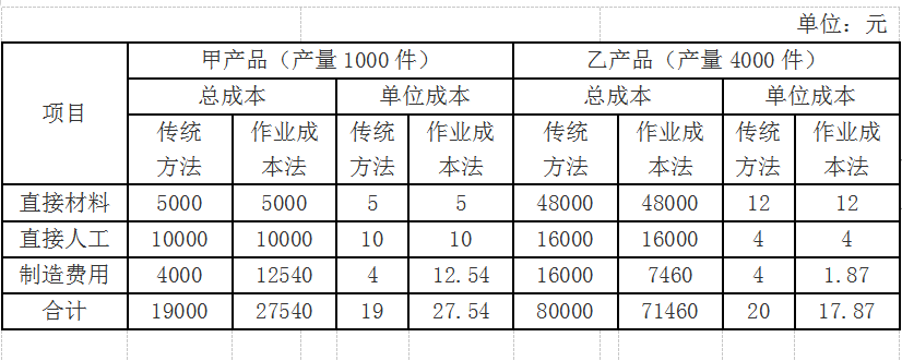 (3)两种成本计算法计算的产品成本如下表所示: