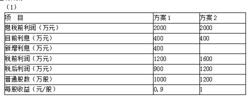 (4)由于方案2每股收益(1元)大于方案1(0.9元),且其财务杠杆系数(1.25)小于方案1(1.67),即方案2收益性高且风险低,所以方案2优于方案1。