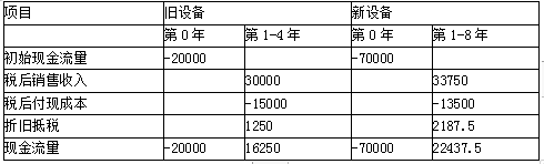 资料再现:使用旧设备初始现金流量-20000元,年营业现金流量16250元,还可用4年;使用新设备初始现金流量-70000元,年营业现金流量22437.5元, 使用8年,项目资本成本10%