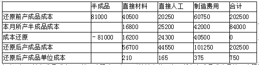 备注:还原前产成品成本,即第二步骤完工产成品的转出数;本月所产半成品成本是第一步骤完工转出数;还原分配率为81000/84000