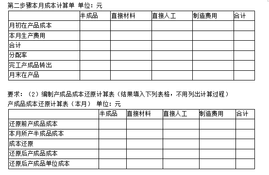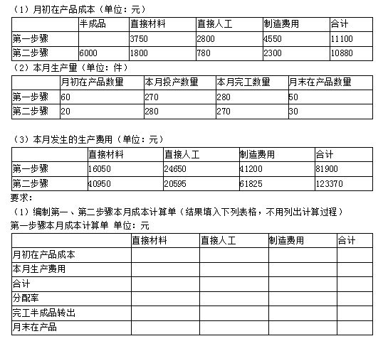 第一步骤耗用的原材料在生产开工时一次投入,其他成本费用陆续发生;第二步骤除耗用第一步骤半成品外,还需要追加其他材料,追加材料及其他成本费用陆续发生;第一步骤和第二步骤月末在产品完工程度均为本步骤的50%。