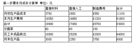 第二步骤本月成本计算单 单位:元