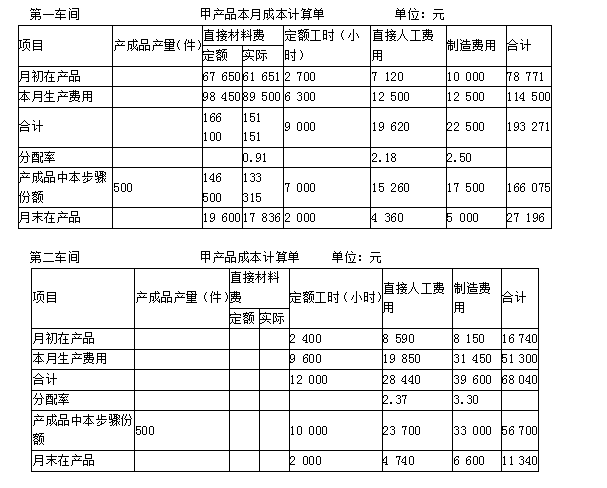 某企业生产甲产品,生产分两步骤在两个车间内进行,第一车间为第二车间提供半成品,第二车间加工为产成品。产成品和月末在产品之间分配费用的方法采用定额比例法;材料费用按定额材料费用比例分配,其他费用按定额工时比例分配。假设该企业月末没有盘点在产品,月末在产品定额根据月初在产品定额加本月投产定额减产成品定额计算。甲产品相关定额资料如下表。