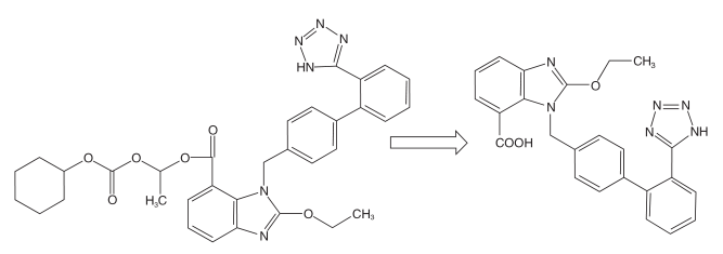 坎地沙坦酯是AⅡ受体拮抗剂,坎地沙坦酯在体内需要转化为坎地沙坦才能产生药物活性,体内半衰期约9小时,主要经肾排泄,坎地沙坦口服生物利用度为14%,坎地沙坦酯的口服生物利用度为42%,下列是坎地沙坦酯转化为坎地沙坦的过程: