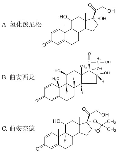 药物分子中9位氟原子增加了抗炎活性,16位羟基降低9位氟原子带来的钠潴留副作用,将此羟基和17位羟基与丙酮生成缩酮,改善了药物动力学性质。该具有缩酮结构的药物是( )。