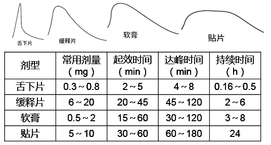 硝酸甘油可以制成多种剂型,进而产生不同的吸收速度、起效时间、达峰时间和持续时间,药时曲线、相关参数如下所示。关于该药物不同