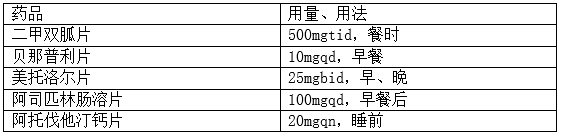 患者,男,74岁,患有冠心病、高血压、高脂血症,2型糖尿病和严重骨质疏松症。无偏食,每日饮牛乳300ml。药师记录的患者用药情况如下表: