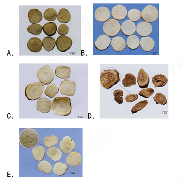 试卷附图图16~图20中,图示饮片为天花粉的是( )。