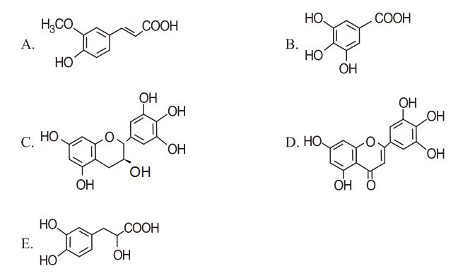 <p>内含咖啡酸和奎宁酸结构片段,有抗菌作用的化合物是( )。<img title="" alt="" src="https:/