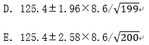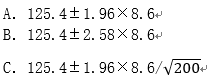 测得某地200名健康成年人的血红蛋白含量均数为125.4g/L,标准差为8.6g/L,则其95%医学参考值范围为( )。