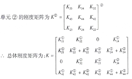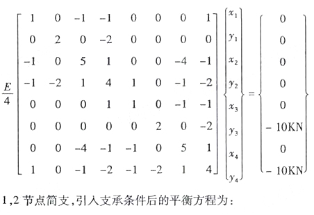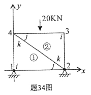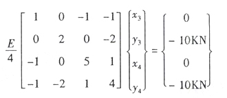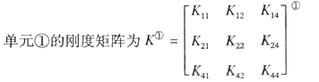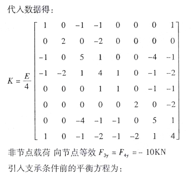 如图示,边长为1米,厚度为1厘米的正方形板,其上边中点处受到20KN力的作用,力的方向垂直向下。采用三角形单元进行有限元分析,节点、单元及局部码、总码如图示,节点1、2为简支。单元①、②的刚度矩阵相同,为 引入支承条件,写出平衡方程。