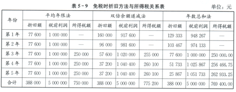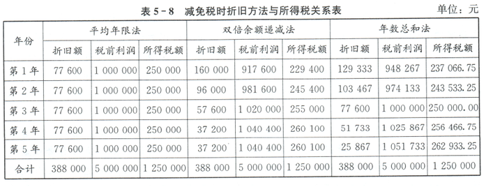 从表5-8中可知,不同折旧方法对不同年份的应纳税额产生了影响。以第1年为例,企业应纳所得税额在平均年限法、双倍余额递减法和年数总和法下分别为250000元229400元、237066.75元。若选用双倍余额递减法,当年企业应纳税额最少。