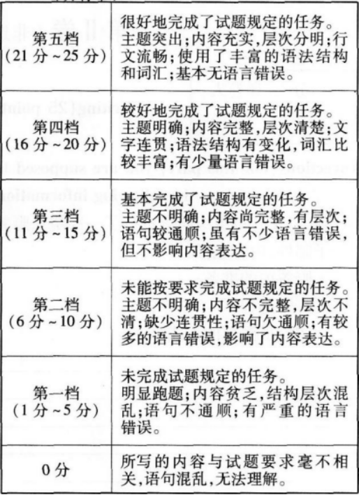 (2)评分时,先根据文章的内容和语言确定其所属档次,然后根据该档次的具体要求给分。(3)纳入第五档次的作文应取得至少两位阅卷教师的认可。