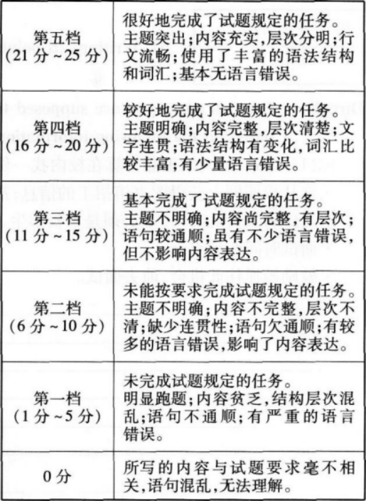 (2)评分时,先根据文章的内容和语言确定其所属档次,然后根据该档次的具体要求给分。(3)纳入第五档的作文应取得至少两位阅卷教师的认可。