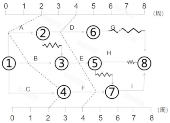 某项目时标网络计划第2.4周末实际进度前锋线如下图,关于该项目进度情况的说法,正确的有( )。