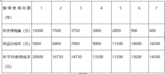 【题目解析】:从给定的图表中,我们可以看到设备的年运行成本随着使用年限的增加而逐渐增加,而设备的残值则保持不变。设备的经济寿命是指设备在其使用过程中,其年平均使用成本达到最低值的那一年。 要确定设备的经济寿命,我们需要计算每年的平均使用成本。平均使用成本是设备的年运行成本(包括维护、修理等费用)与设备的年折旧费用之和,再除以设备的总价值(原值减去残值)。由于我们没有具体的年运行成本数据和残值数据,但可以根据图表趋势和常识来判断。 通常,随着设备使用年限的增加,年运行成本会增加,而设备的折旧费用(即设备价值的减少)会减少。在设备使用的早期阶段,折旧费用占比较大,因此平均使用成本可能较高。随着使用年限的增加,折旧费用逐渐减小,但运行成本增加,平均使用成本可能会在某个点达到最低,这个点就是设备的经济寿命。 从图表中可以看出,在第3年到第4年之间,年运行成本的增加速度似乎开始加快,而折旧费用减少的速度开始放缓。这意味着在第3年之前,平均使用成本可能是递减的,而在第4年及以后,平均使用成本可能会开始递增。 因此,我们可以合理推断,该设备的经济寿命是在第3年和第4年之间。但由于题目要求选择一个具体的年数,并且我们通常选择平均使用成本开始递增的前一年作为经济寿命,所以答案是C,即设备的经济寿命为5年。