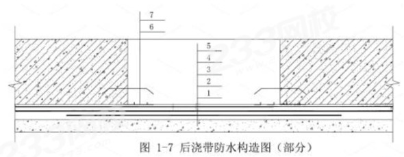 【正确答案】:1-基础垫层;2-防水找平层;3-防水加强层;4-卷材防水层;5-防水保护层;6-外贴止水带;7-止水钢板。